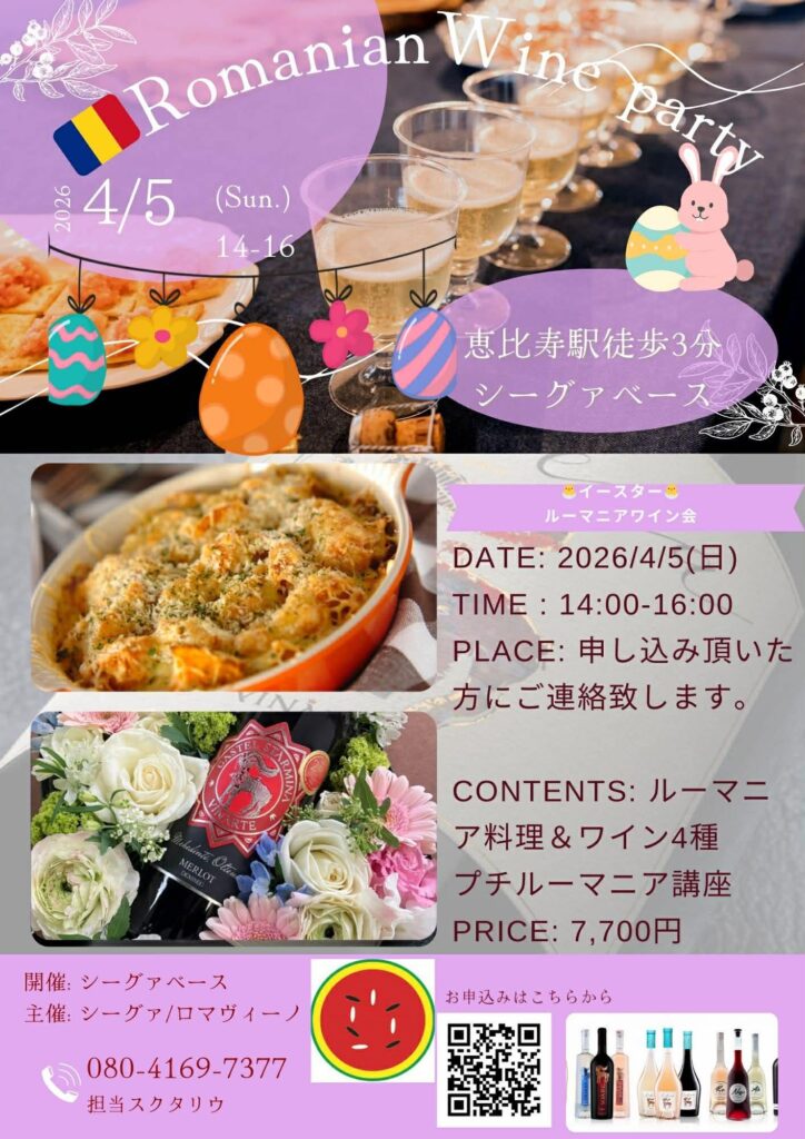2026年4月5日(日)14〜16時 ルーマニアワインパーティー